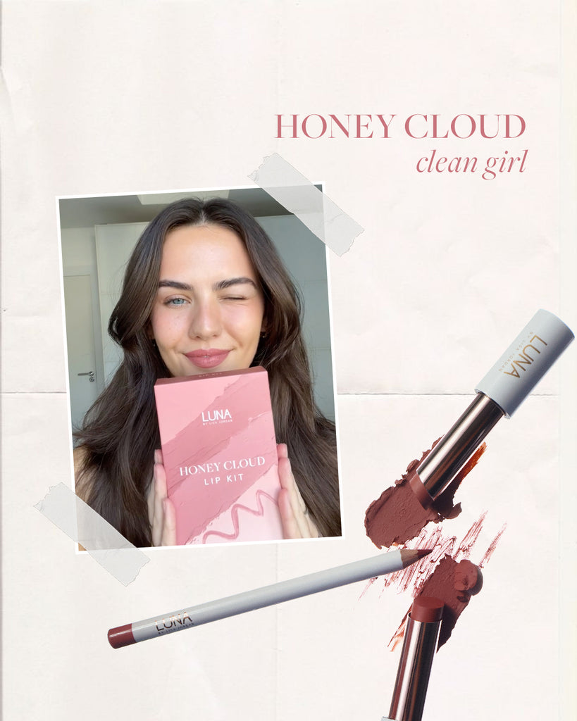 For a perfect true nude, apply Honey Kiss Lipstick and define with Morganite Liner, a deep rose shade infused with pinky-brown undertones. Use Cloudy Lipstick, balanced with complementary hues of pink, brown and nude, for a gentle rosy hue and complete the look with Morganite Liner for subtle definition.
